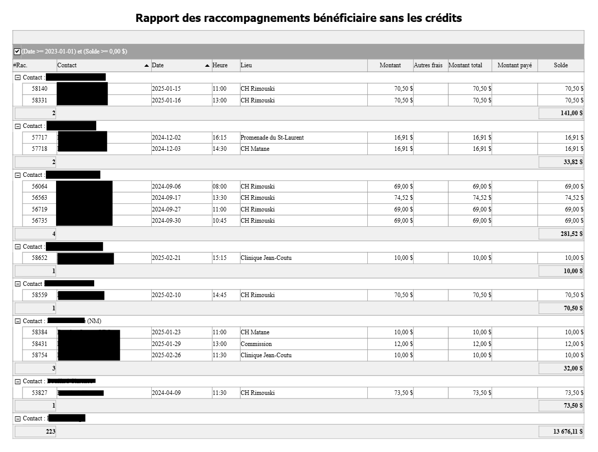 Ce rapport affiche toutes les demandes de transport payées par des payeurs organismes (programme), pour une période choisie.