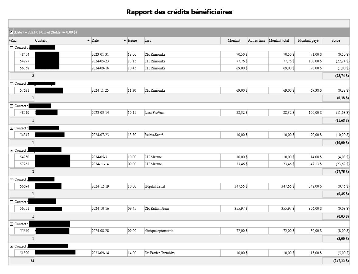 Le rapport des crédits bénéficiaires affiche toutes les demandes de transport sur lesquelles un surplus a été payé. Il permet d'indiquer les crédits totaux pour chaque bénéficiaire qui ont payés un surplus pendant une période choisie.