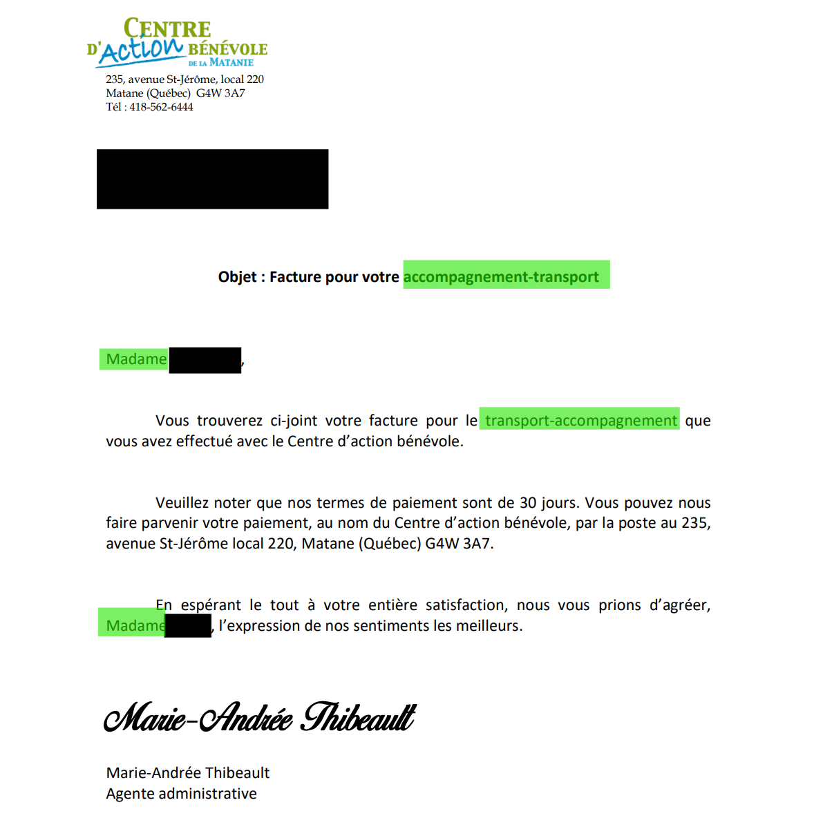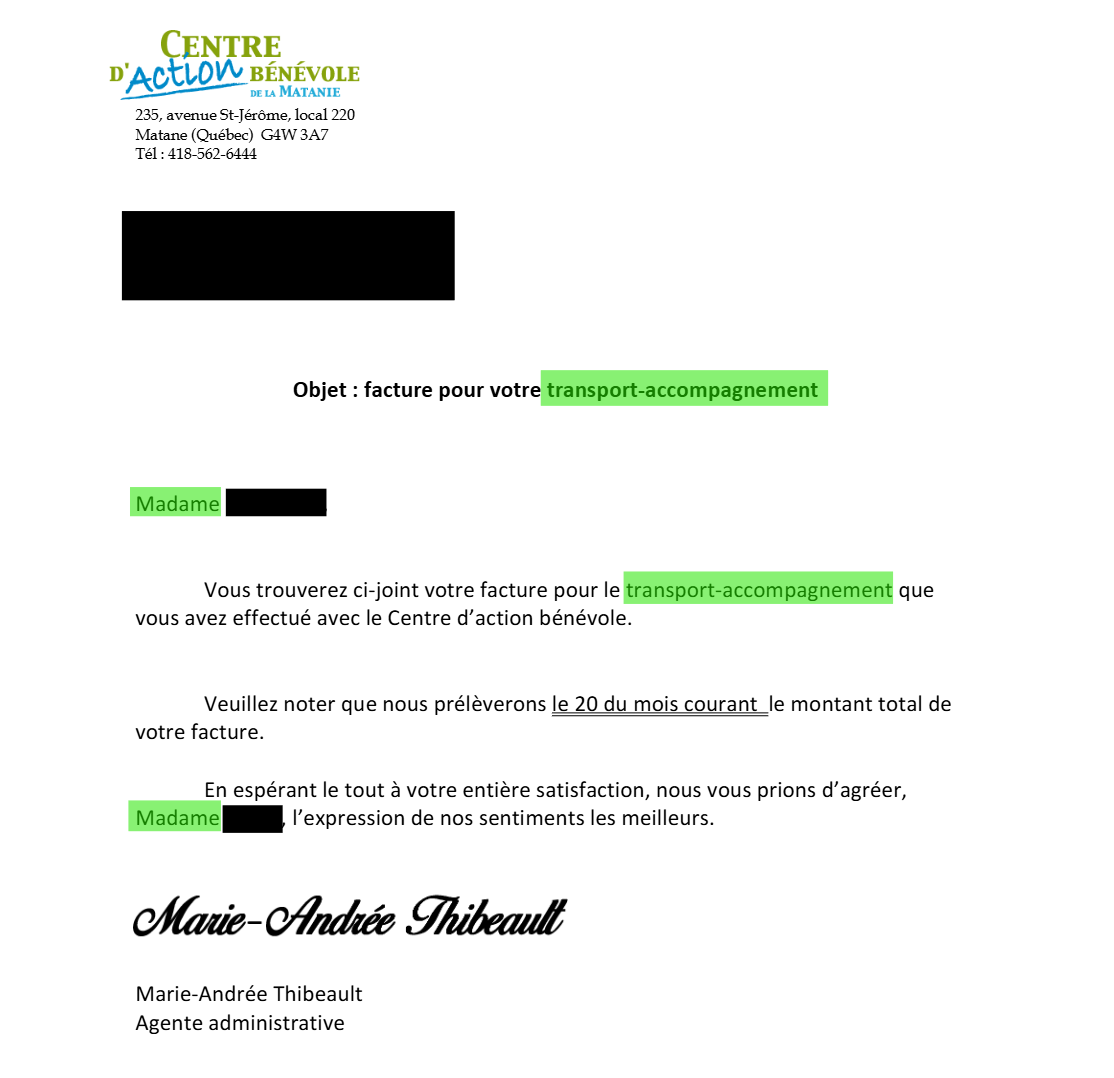 Nous avons configuré, comme pour la lettre précédente, la lettre avec les différentes variables pour qu'elle s'ajuste selon le client et le service utilisé.