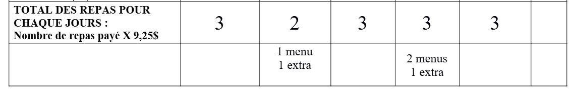 Le système calcul ensuite le total de repas pour chaque journée. Pour les journées dont les repas sont uniquement des repas principaux, le système inscrit seulement le nombre de repas à livrer. Pour les journées ou certains clients doivent recevoir des repas alternatifs, le système doit inscrire le nombre de repas totaux mais détailler le nombre de menu (repas principal) et d'extra (repas alternatif)