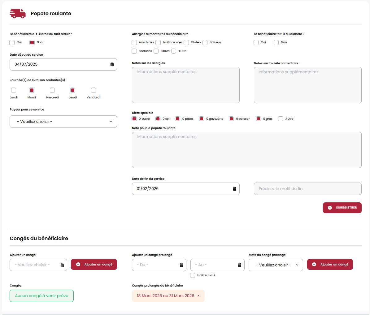Congés : Il est possible d'ajouter un congé de popote pour une journée ou un congé prolongé pour un client.