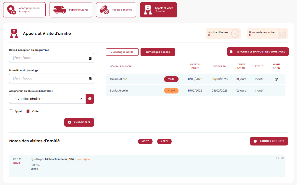 Le volet visite et appels d'amitié permet de jumeler un bénévole a un client pour le service de visite ou d'appel. Il est possible de laisser des notes ou de mettre fin à un jumelage en plus de pouvoir exporter le rapport des jumelages pour chaque client.