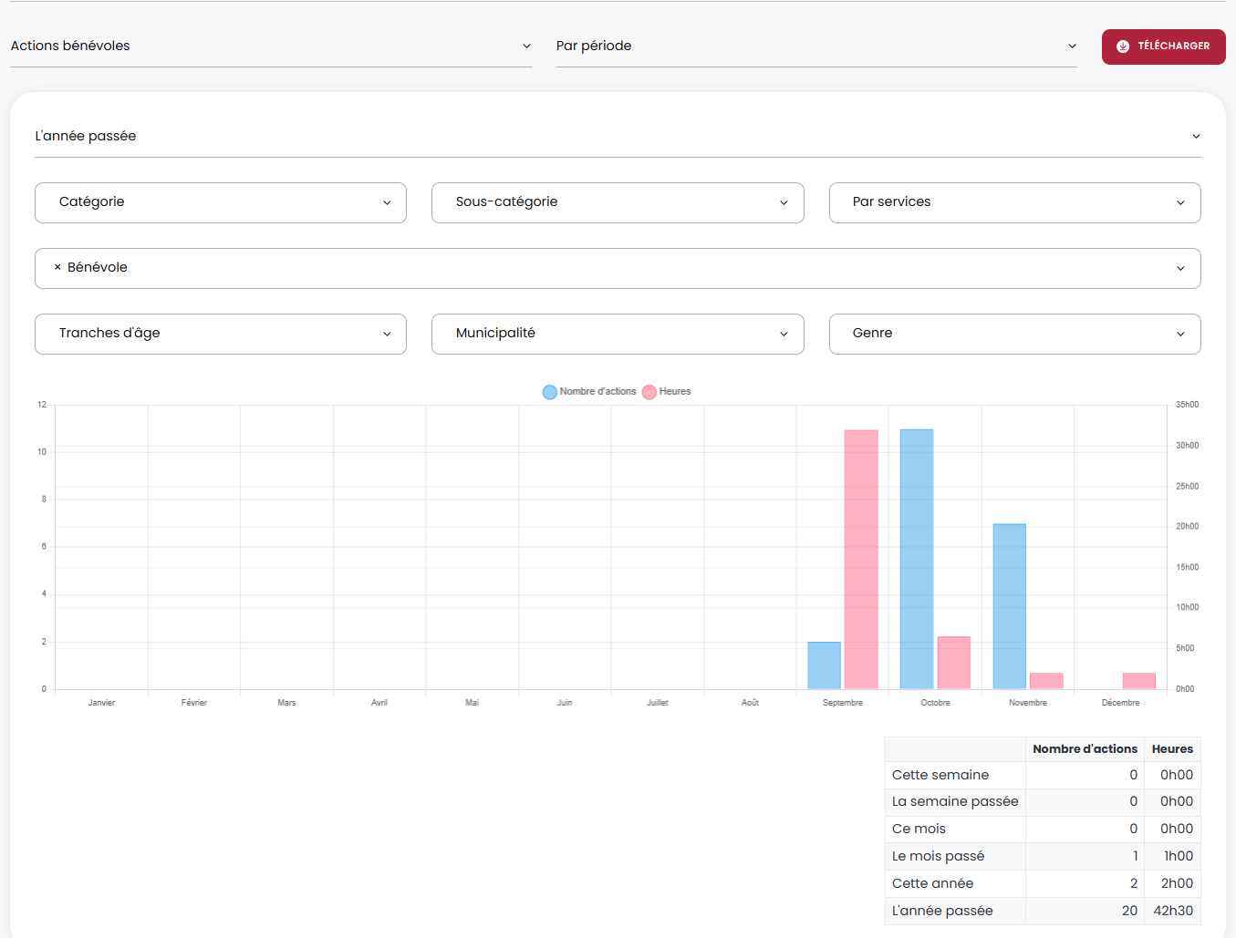 Le rapport des actions bénévoles permet de filtrer selon plusieurs critères :