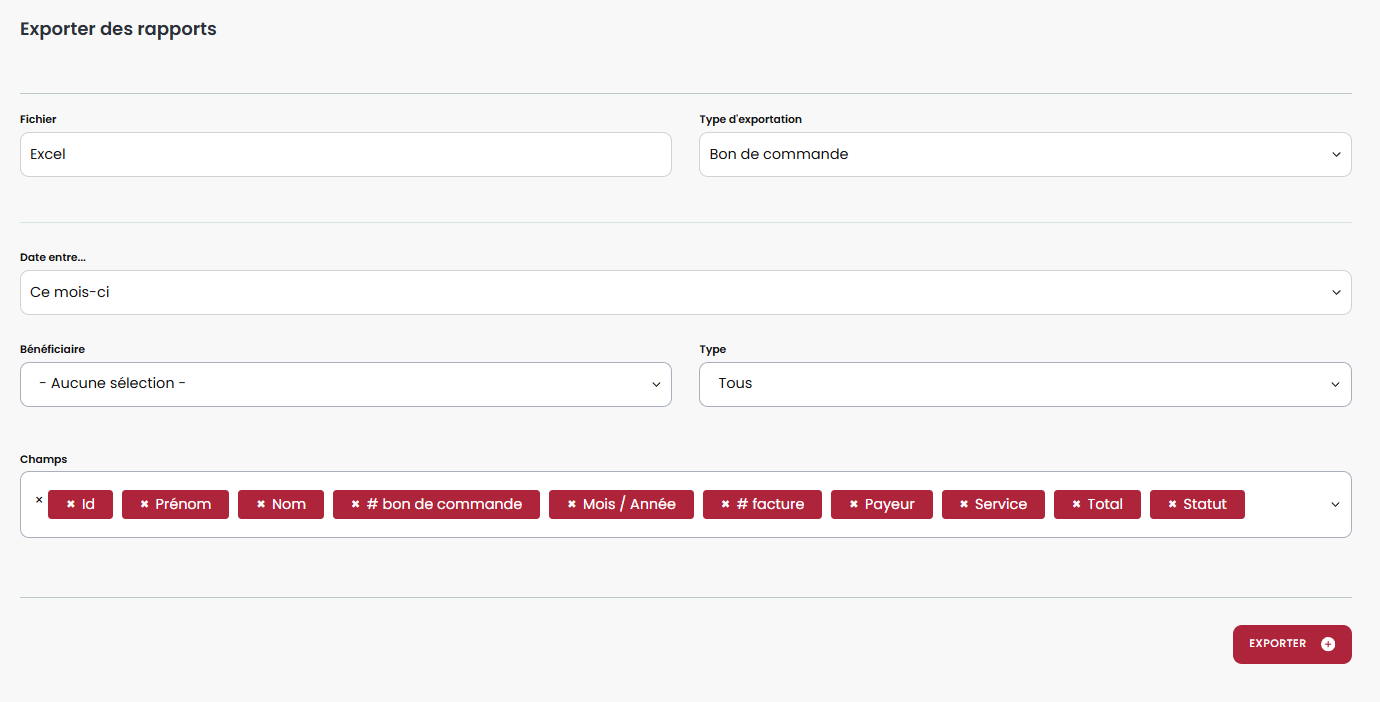 Un bon de commande est créé automatiquement lors de la création d'une demande de transport ou d'une commande de repas chauds ou congelés. Pour la facturation mensuelle, les bons de commandes se mettent à jour automatiquement si une demande de transport s'ajoute, dans le même mois ou si une journée dans la commande de repas chauds est annulée. À la fin du mois, le bon de commande est prêt à être générer en facture.