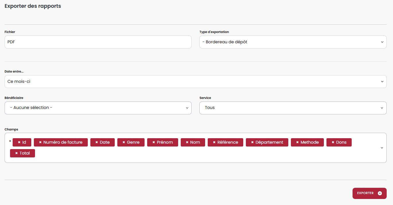 Pour le rapport personnalisé des bordereaux de dépôt, il est possible de filtrer :