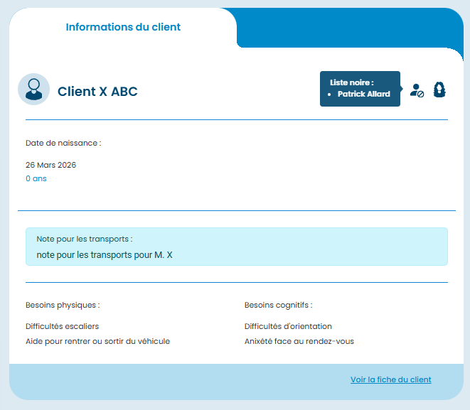 Les informations importantes affichent chaque fois que le client est sélectionné dans une demande de transport.