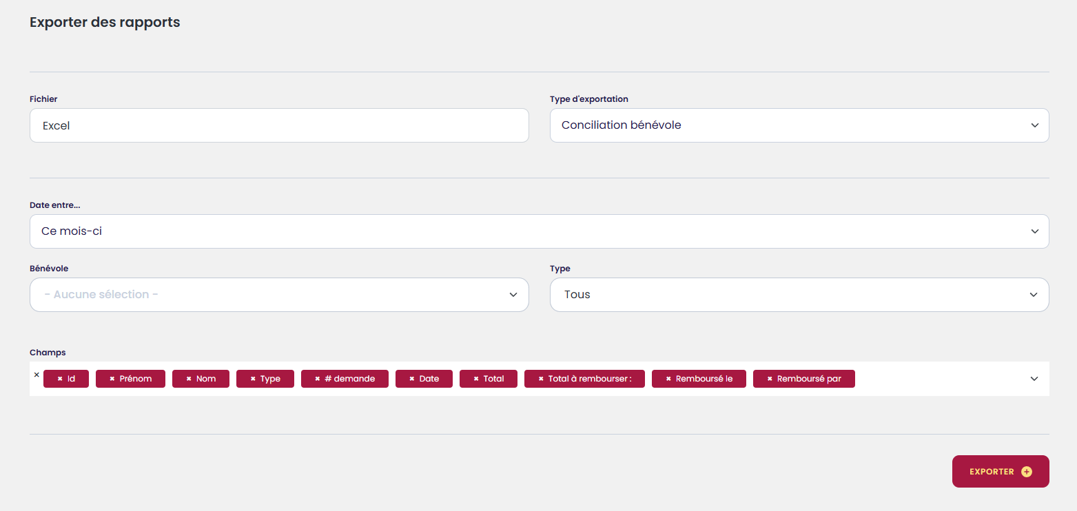 Il est possible de sortir un rapport pour tous les bénévoles ou de les filtrer par :