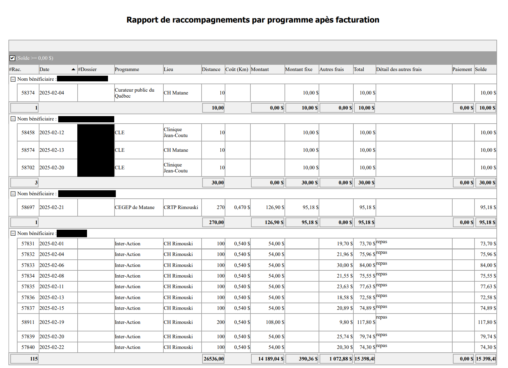 Ce rapport affiche toutes les demandes de transport payées par des payeurs organismes (programme), pour une période choisie.