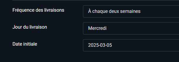 Nous avons dû modifier le fonctionnement de la sélection des journées de repas pour les commandes automatisées puisque notre client nous a fait part que les journées de livraison peuvent être différente en fonction des semaines du menu.