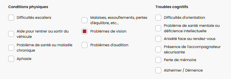 Nous avons ajouté des options cochables pour la mobilité et le transport du client.