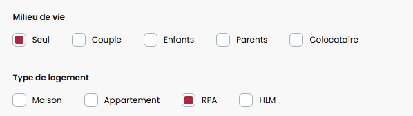 Options ajoutées, dans les informations générales, permettant de coché les valeurs applicables sur le milieu de vie et le type de logement du client.