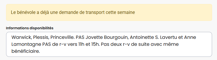 Nous avons ajouter la possibilité de mettre un note sur les disponibilités du bénévole. Cette note affiche chaque fois qu'un bénévole est sélectionné dans une demande de transport.