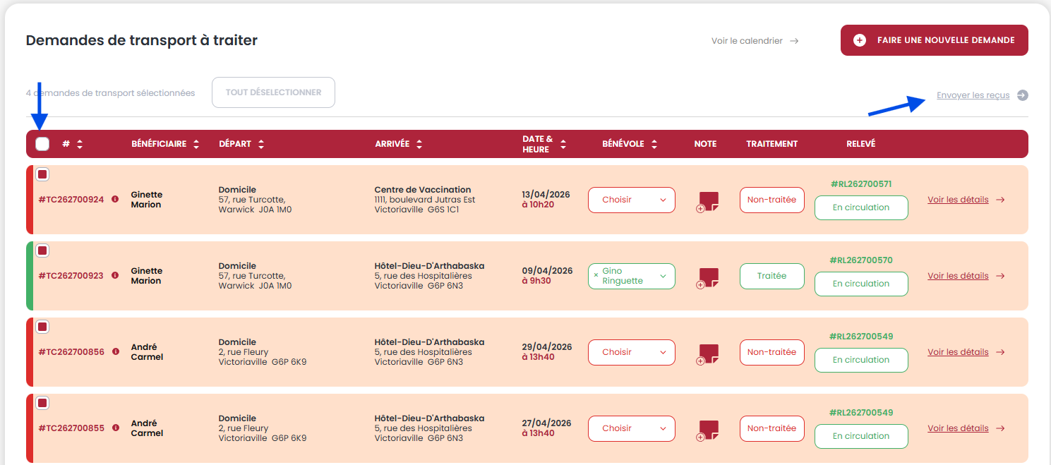 Il faut simplement sélectionner le bénévole et la période. Toutes les livraisons effectuées par le chauffeur pendant cette période afficheront, dans le bas.