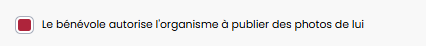 Pouvoir cocher si le bénévole autorise l'organisme à publier des photos de lui. Nous avons également ajouter un filtre sur la liste des bénévoles pour avoir la liste de ceux qui n'ont pas donné leur consentement.
