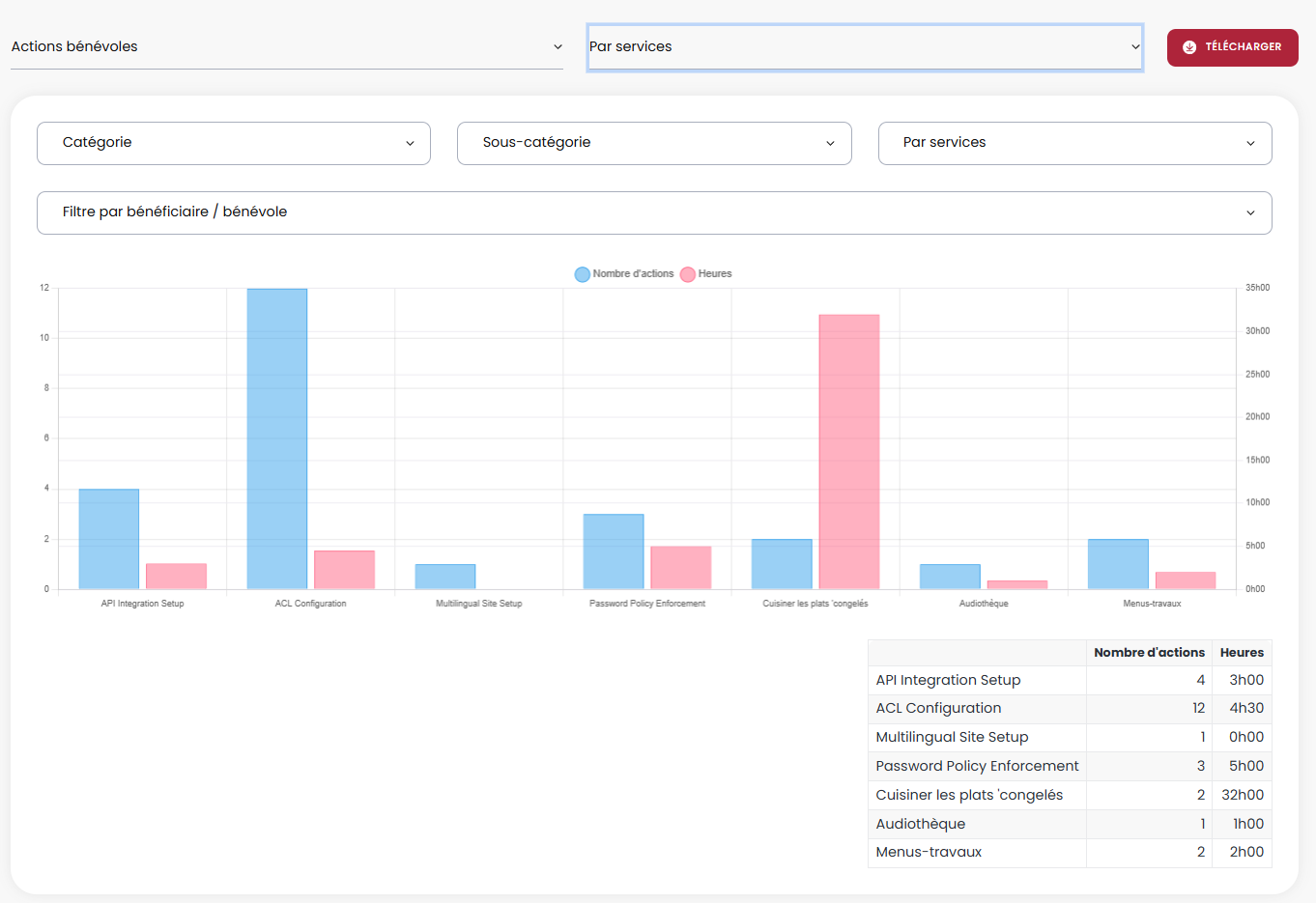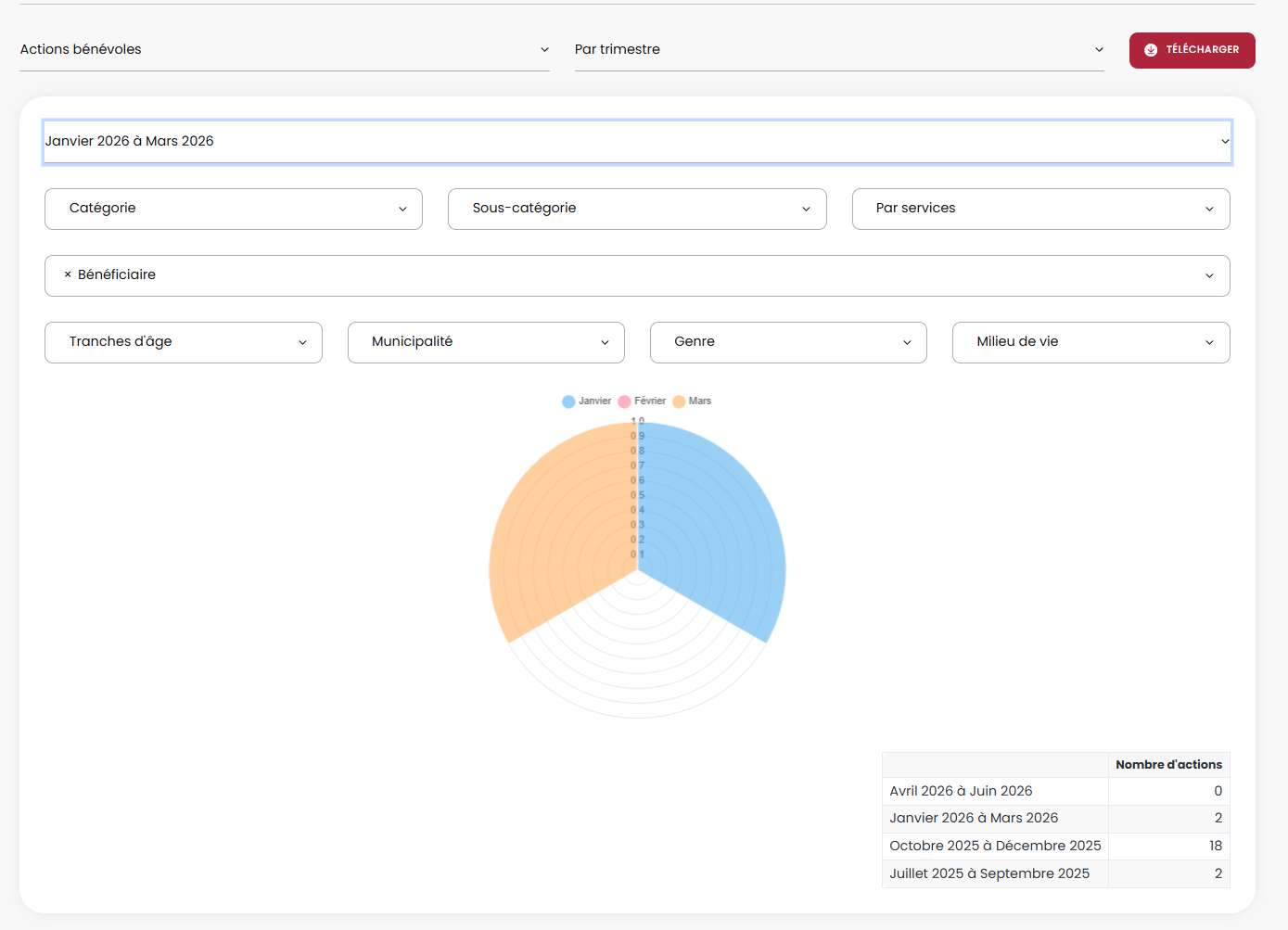 Le rapport des actions bénévoles permet de filtrer selon plusieurs critères :