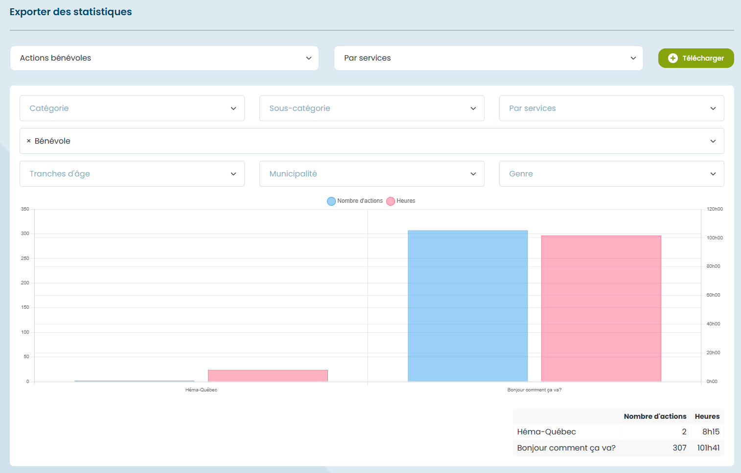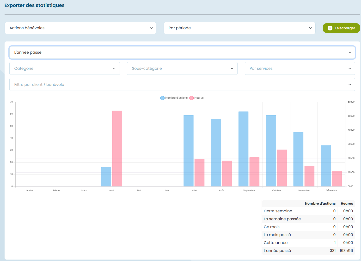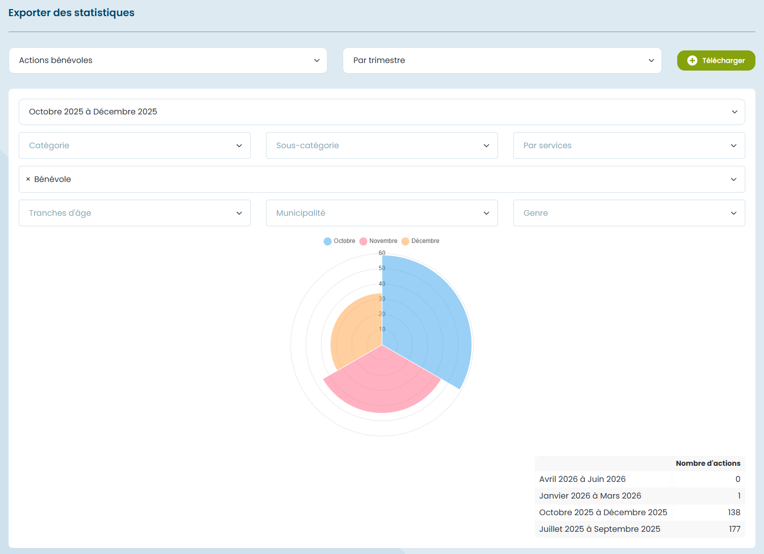 - Statistiques des bénévoles (pour le trimestre choisi)
