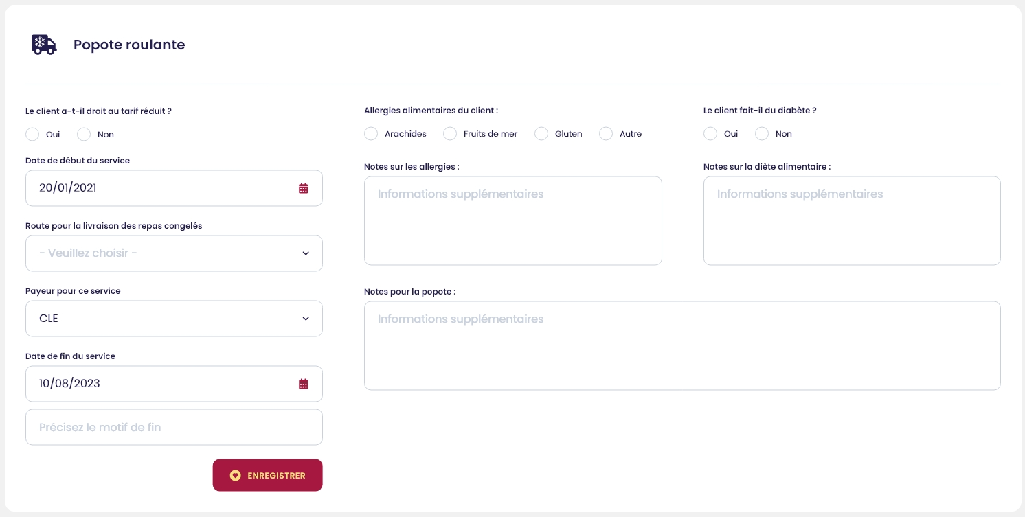 Permet d'ajouter toutes les informations pertinentes sur le service de popote roulante. La route de livraison, les allergies du client, s'il est diabétique ou non, Note pour la popote qui affiche sur la liste de livraison des repas, etc.