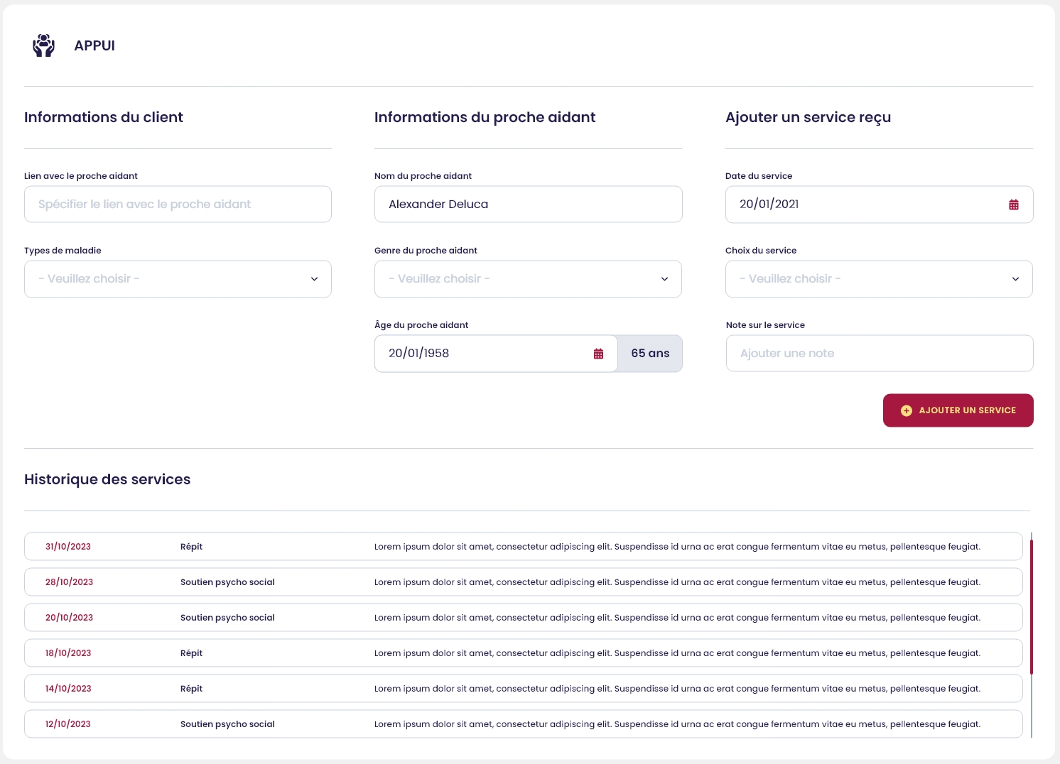 La plus importante partie du volet est de pouvoir ajouter des services rendus au proche aidant (répit, soutien psychosocial, etc). L'historique des services se trouvent juste en dessous et peut être consultée, en tout temps.