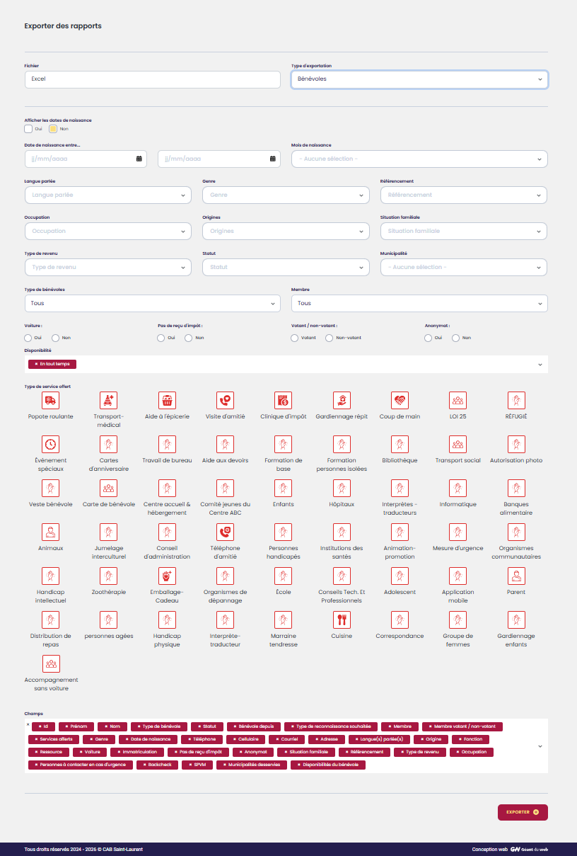 Il est possible de sortir un rapport pour tous les bénévoles ou de les filtrer par :