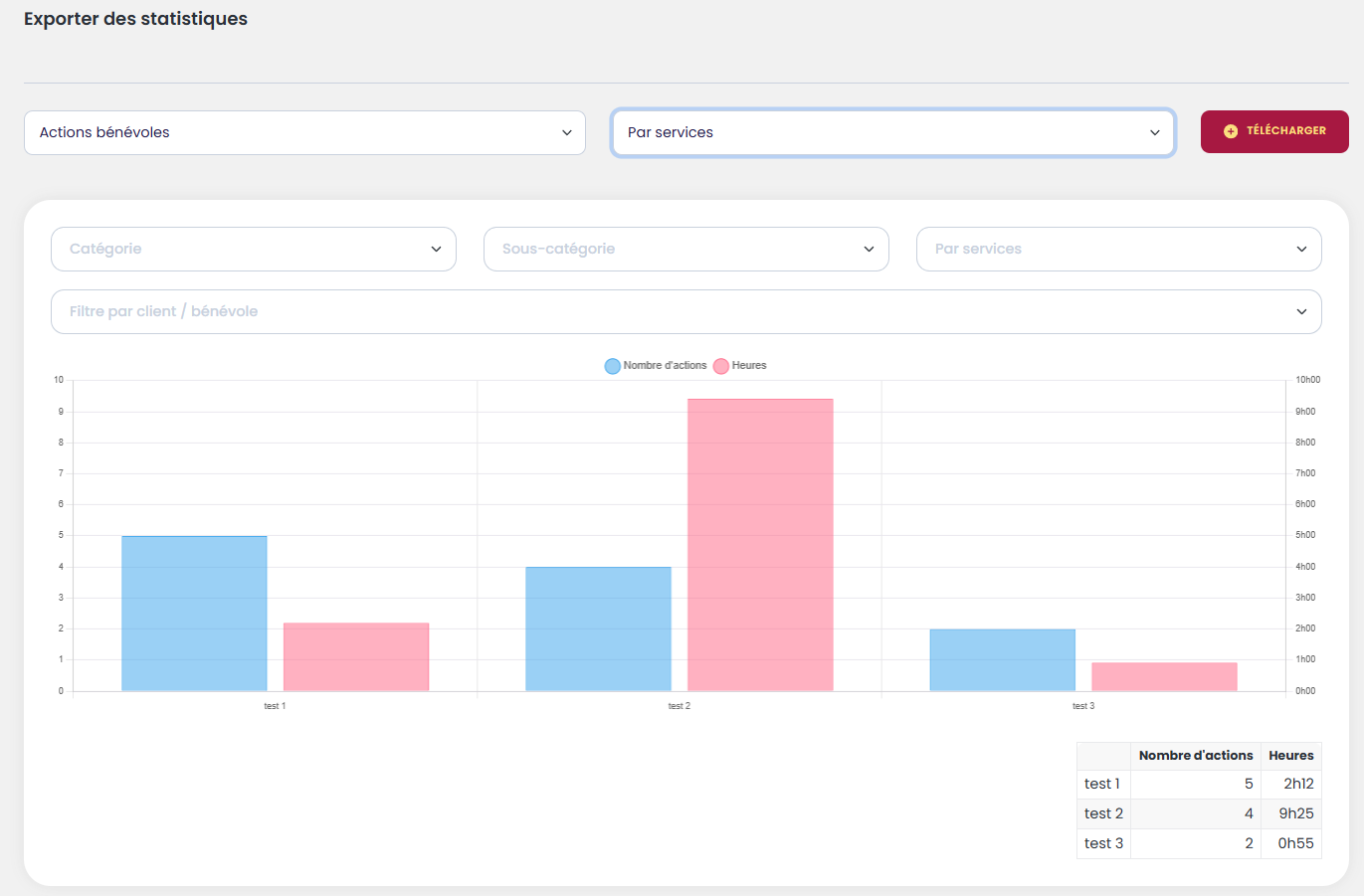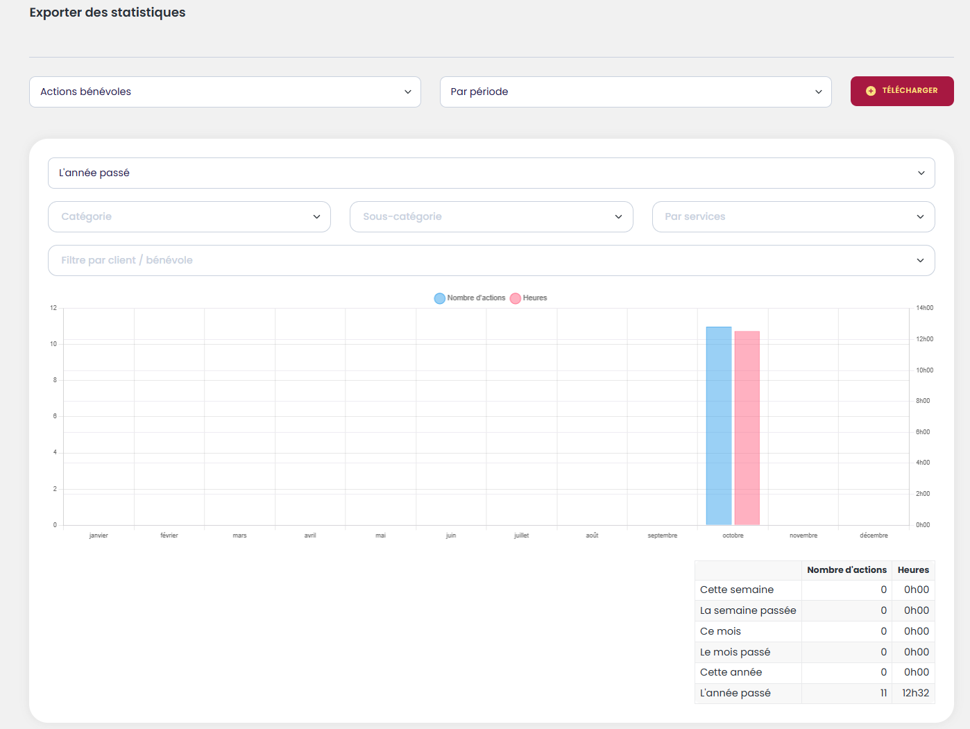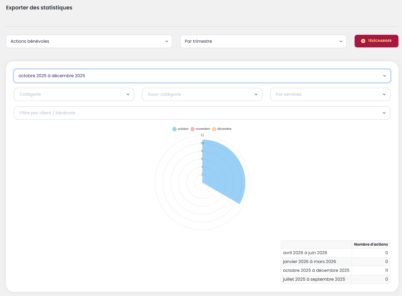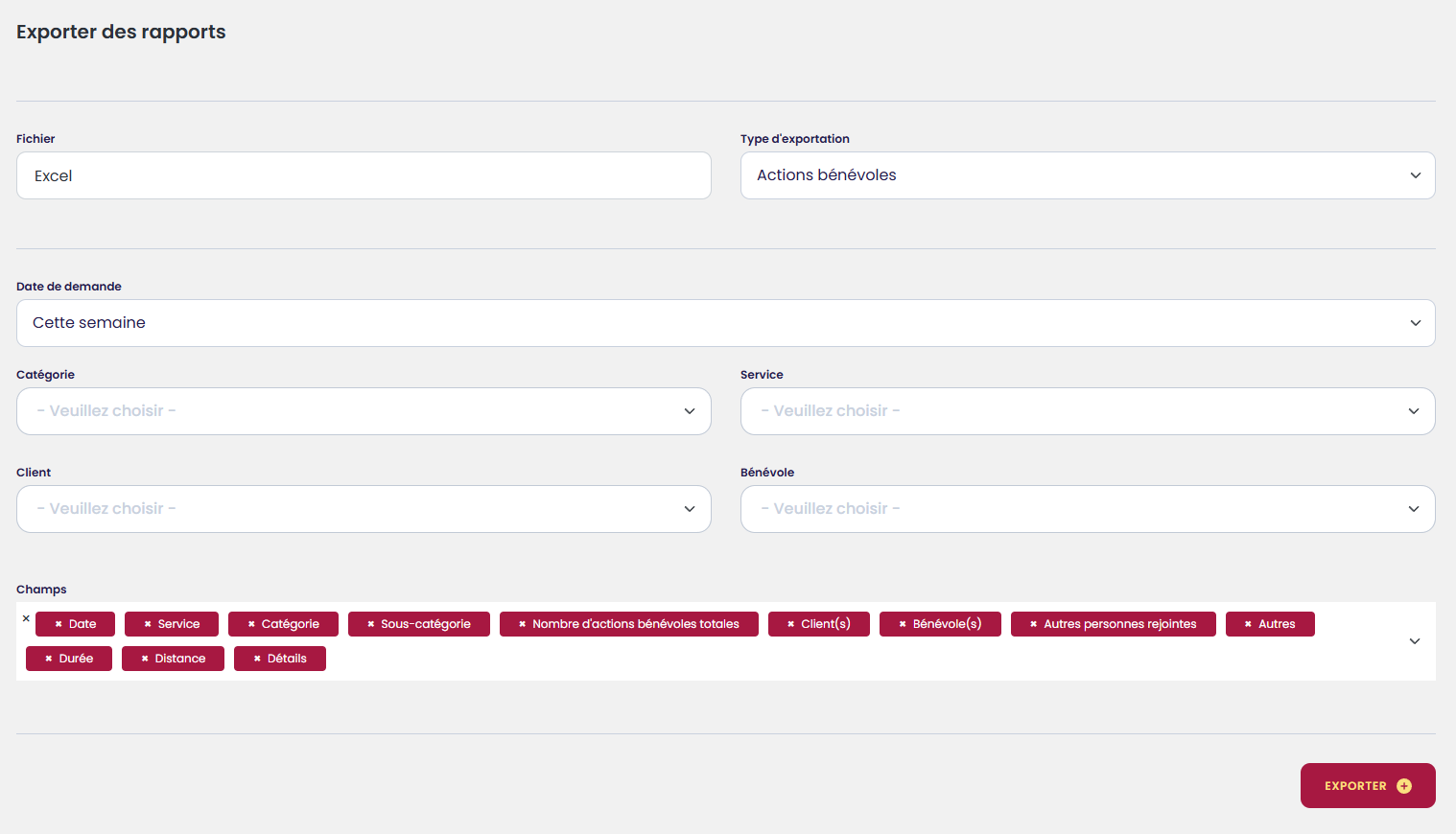 Le rapport des actions bénévoles permet de filtrer selon plusieurs critères :