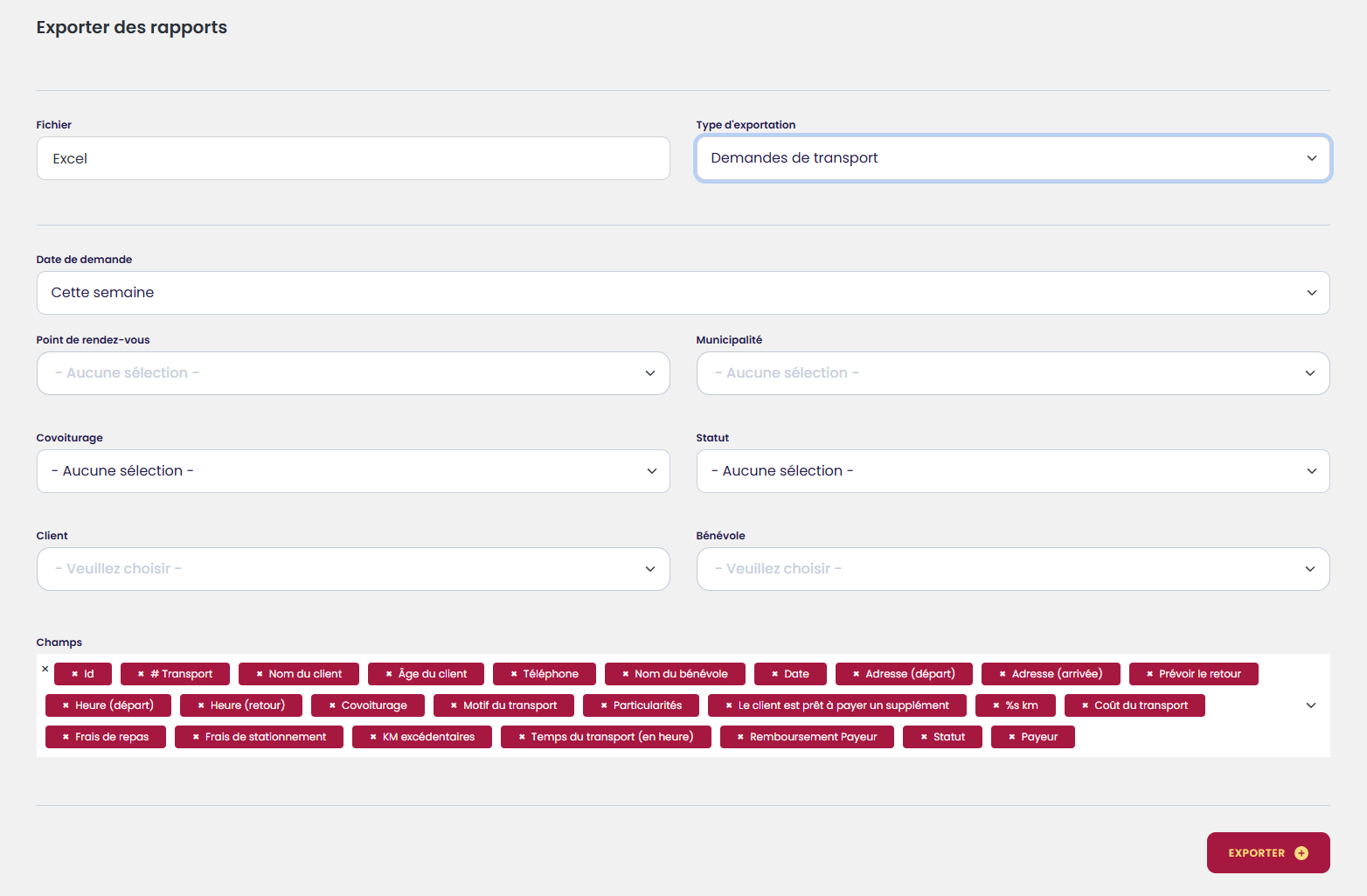 Pouvoir sortir la liste complète de toutes les demandes de transport. Il est également possible de filtrer par :