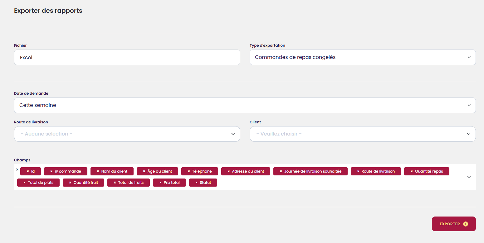 Il est possible de sortir un rapport pour les commandes de repas chauds ou congelés et de filtrer la liste par :