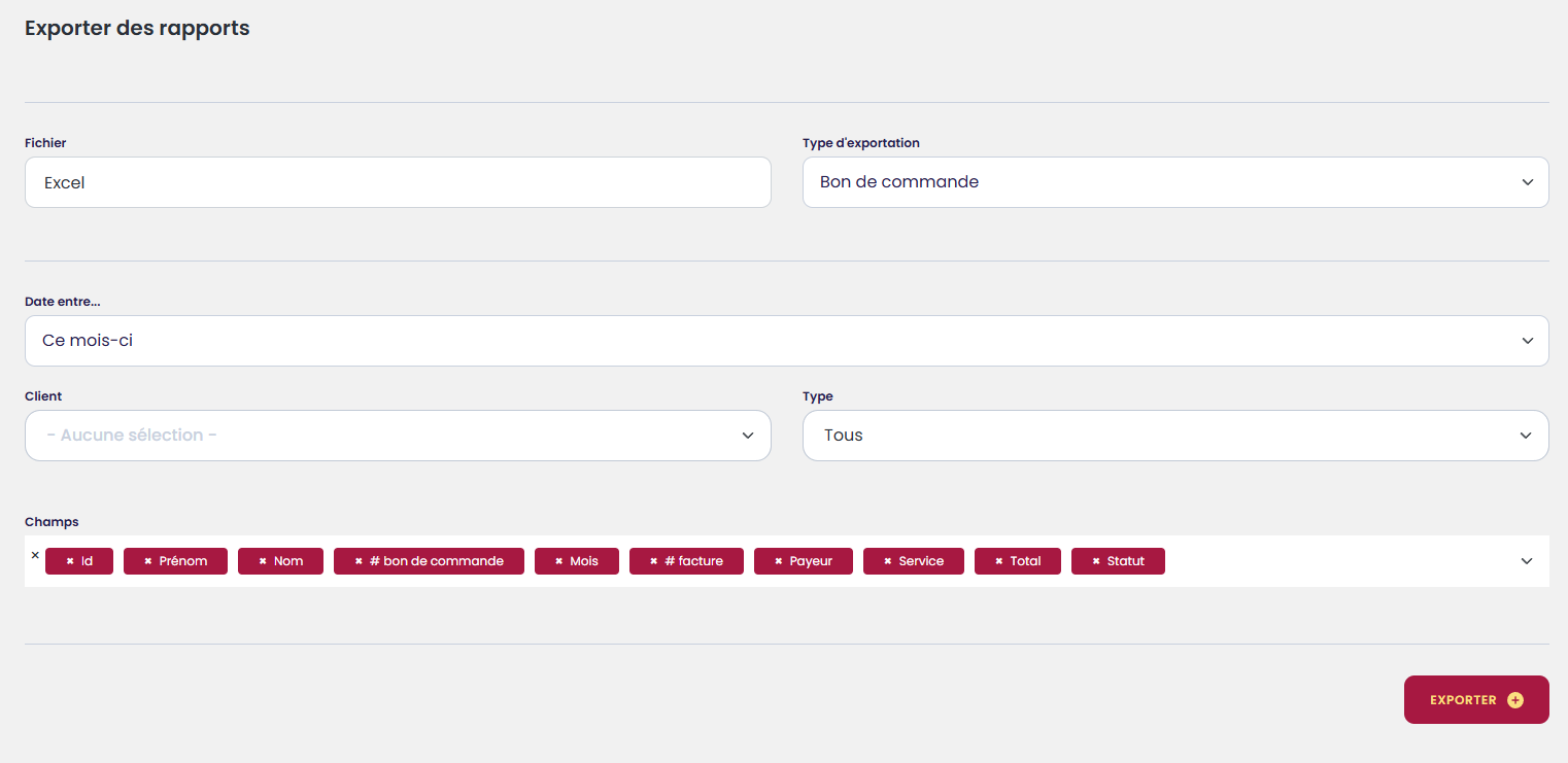 Un bon de commande est créé automatiquement lors de la création d'une demande de transport ou d'une commande de repas chauds ou congelés. Pour la facturation mensuelle, les bons de commandes se mettent à jour automatiquement si une demande de transport s'ajoute, dans le même mois ou si une journée dans la commande de repas chauds est annulée. À la fin du mois, le bon de commande est prêt à être générer en facture.